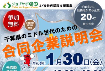~千葉県のミドル世代のための、企業との出会いの場です~ 1月30日に、千葉県のミドル世代のための合同企業説明会を開催します。 今回の合同企業説明会も、ミドル世代を含めた正社員を募集している企業が参加しま...