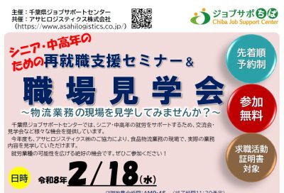 職場見学会&企業との交流会を開催します。 千葉県ジョブサポートセンターでは、ミドル世代の就労をサポートするため、交流会・見学会など様々な機会を提供しています。 今回、アサヒロジスティクス株式会社様...