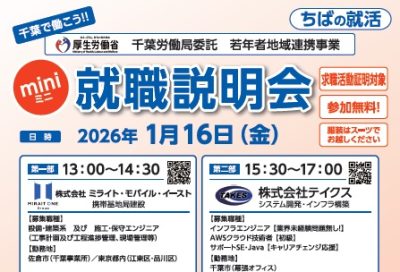 企業説明会(ミニ就職説明会・オンライン企業説明会) 千葉県で「若者を採用したい!」という中小企業を招き、企業担当者から会社概要や業務内容、求人内容などの説明が聞けます。 「企業や仕事」の話を聞いて、...