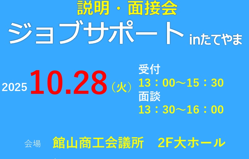 「安房地域の企業」と「安房地域で働きたい人」をつなぐマッチングイベントとして開催している『ジョブサポートinたてやま』。今年度は10月28日(火)に開催いたします。南房総エリアでお仕事を探している方はぜひご参加ください。