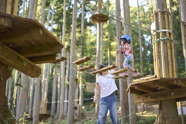 体験型リゾート施設「リソルの森」では、グランピングや天然温泉をはじめ、空中アスレチックやジップスライドなどのアクティビティが楽しめる「フォレストアドベンチャー・ターザニア」があり、お子さまから大人まで自然を感じながら楽しむことができます。