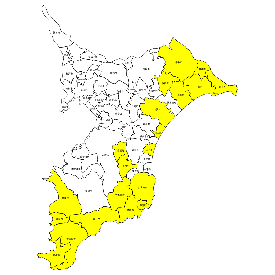 銚子市、館山市、旭市、勝浦市、鴨川市、富津市、南房総市、匝瑳市、香取市、山武市、多古町、いすみ市、東庄町、九十九里町、白子町、長柄町、長南町、大多喜町、御宿町、鋸南町